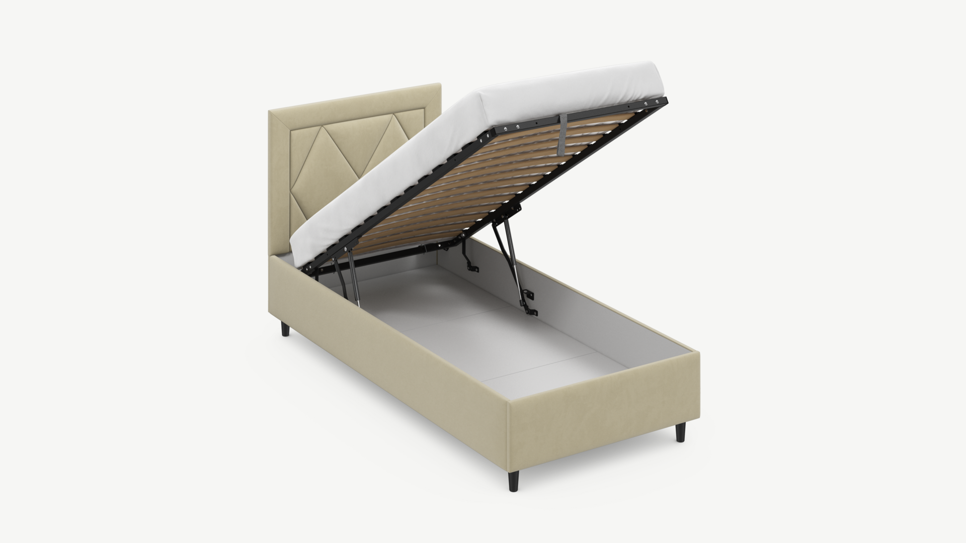 • Скрытая под основанием вместительная емкость без внутренних перегородок позволяет использовать всю площадь подкроватного пространства для хранения вещей.