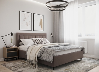 Стежка помещена в центр изголовья и обрамлена, словно картина. Объемные царги завершают цельную фигуру кровати и становятся гармоничным дополнением ее образа.