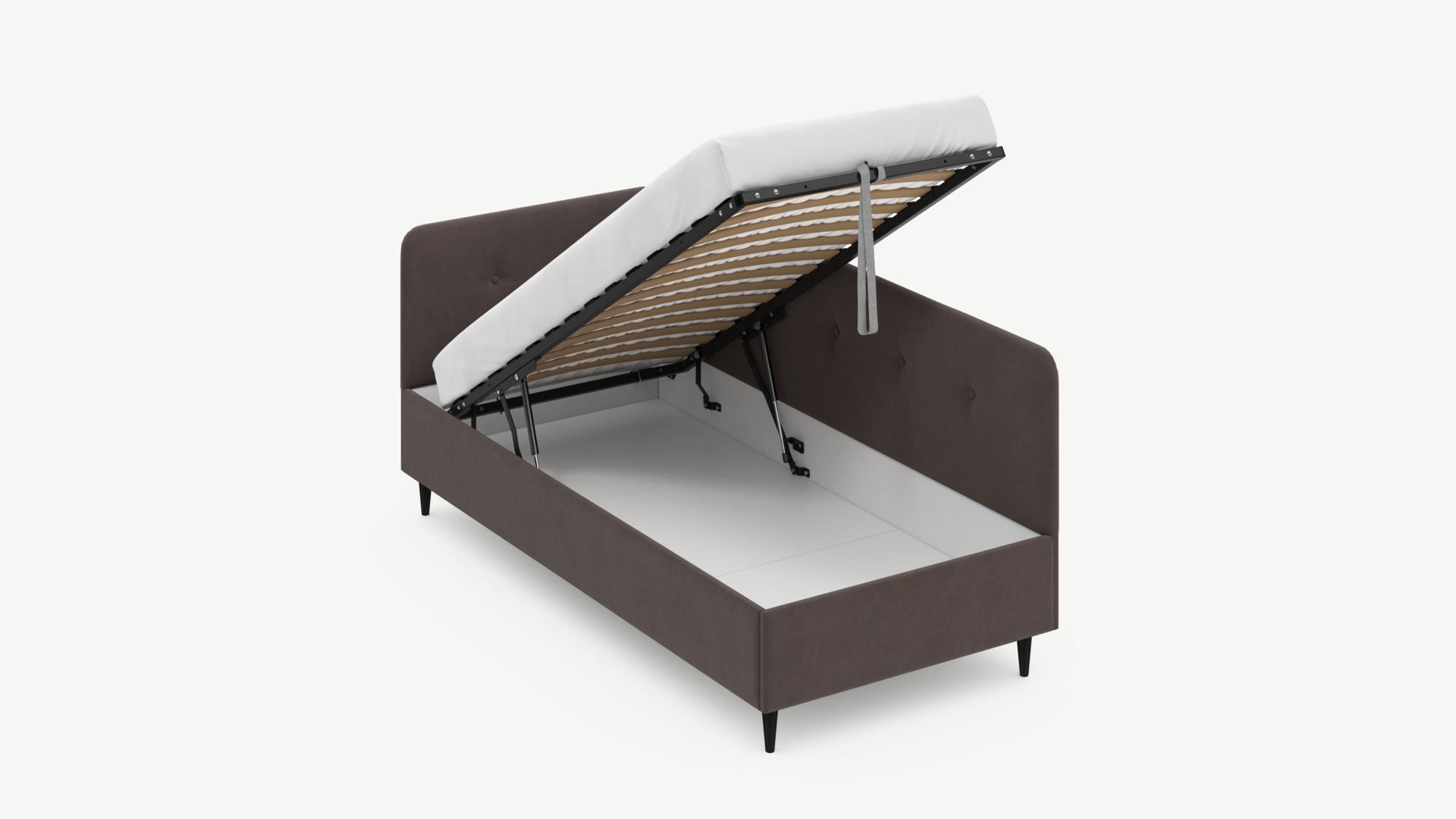 • Скрытая под основанием вместительная емкость без внутренних перегородок позволяет использовать всю площадь подкроватного пространства для хранения вещей.
