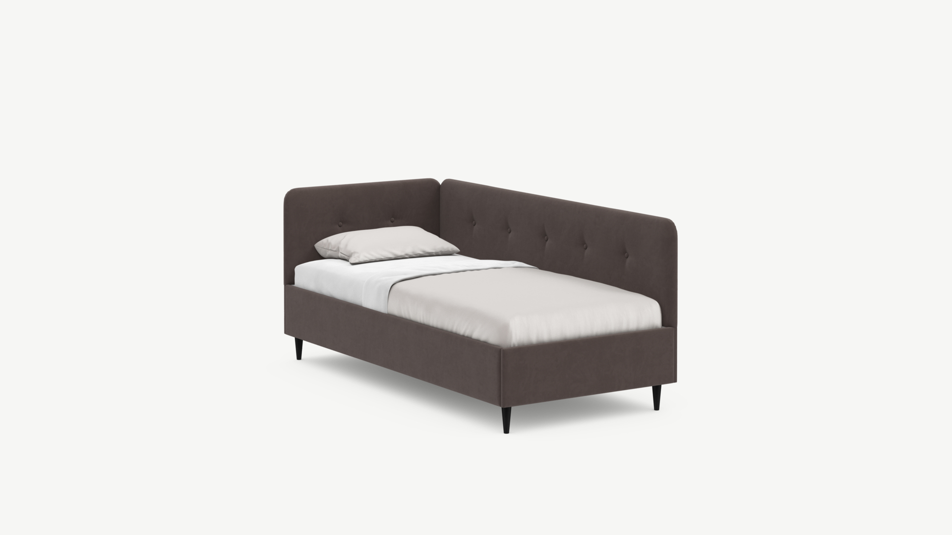 Угловая односпальная кровать MOON FAMILY 1253 с мягкой спинкой и изголовьем обладает округлыми формами, привносящими в интерьер нотки нежности. Изголовье, украшенное пуговицами, добавляет окружающему пространству шарм и уют. Высокие опоры придают кровати визуальной легкости, а также обеспечивают удобство во время уборки.